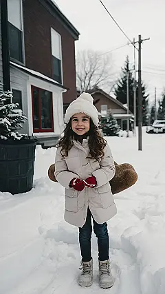 This adorable little Canadian is all bundled up and ready to embrace the magic of Christmas! Imagine snuggling up by a warm fireplace after a snowy adventure, sipping hot chocolate and feeling the cozy Christmas spirit. Her bright red coat matches the festive decorations twinkling in the background, and those fluffy snow boots are perfect for keeping her toes toasty while she builds a magnificent snowman (or maybe a snow-moose?). It’s the perfect picture of Christmas in Canada – a blend of winter wonderland and heartwarming cheer!