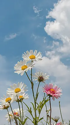 Check out this super chill group of daisies, totally owning their summer nature photography moment! It looks like they got together for the ultimate yearbook photo, all lined up against that epic blue sky. The white ones are clearly the cool, classic crowd, but then you’ve got that one fabulous pink daisy in the corner, totally rocking its unique style. It’s like they’re saying, “Yeah, we woke up like this, naturally gorgeous and ready for our close-up!” You can almost hear them giggling about who gets the most likes.