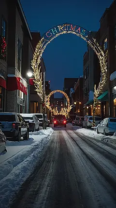 Imagine this: it’s Christmas in Canada, and the snow is falling softly. You’re driving down a street, all cozy and warm in your car, when suddenly – BAM! – you’re greeted by a giant, sparkling Christmas archway! It’s like something out of a holiday movie, complete with twinkling lights and the words “CHRISTMAS” glowing brightly. The street is lined with snow-covered cars, and it’s so picturesque you almost forget you’re supposed to be getting home for Christmas dinner! It’s totally magical, like driving through a postcard.