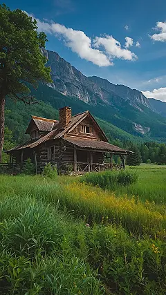 This picture is like a postcard from a peaceful place! There’s a little wooden cabin nestled right in the middle of a green field, and it’s surrounded by tall trees that look like they could whisper secrets to anyone who listens. It’s so calm and quiet, you can practically hear the wind rustling through the leaves. You can just imagine sitting on the porch, watching the sunset paint the sky in gorgeous colours while sipping on lemonade.