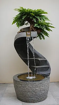 And look at that plant up top! It seems like it’s either the conductor of this whole water orchestra or just a tiny tree trying desperately not to get soaked as the water plunges down. This fountain isn’t just a backyard decoration; it’s basically a miniature watery rollercoaster for tiny aquatic thrill-seekers. It’s a reminder that even something as simple as flowing water can be turned into something surprisingly entertaining and a little bit goofy.