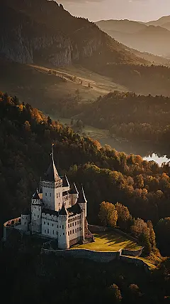 This castle looks like it was ripped straight out of a storybook! It’s perched on a cliff, surrounded by lush green forests and sparkling blue water. The golden light of the setting sun makes everything look even more magical, like something out of a dream. It almost feels like you could hear the sound of knights in shining armor galloping across the fields, or see a princess waving from a tower window.