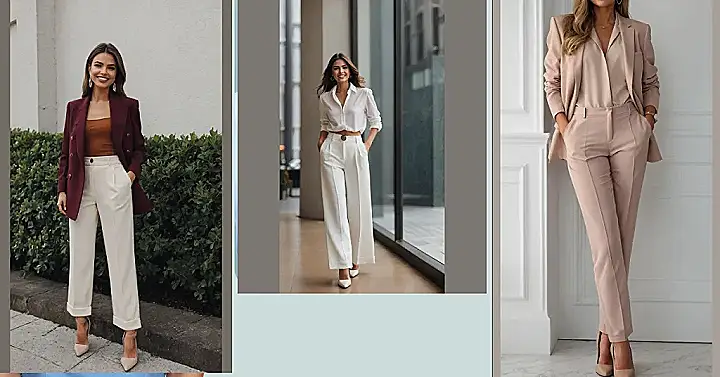 Walking into a room looking this sharp in an all-white outfit is basically a superpower, right? This amazing look shows off how women’s trousers outfits can be super stylish and make you feel like you own the place. Just check out those wide-leg, pleated trousers! They’re not just comfy, they’re like a fashion statement saying, “Yes, I’m fabulous, and no, I didn’t spill anything on myself… yet!” It’s a bold choice that screams confidence, proving that trousers can be anything but boring.
