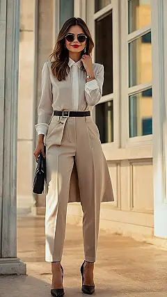 Want to look like you just stepped out of a fancy magazine without breaking the bank? Check out this outfit! It’s the perfect blend of sophisticated and stylish. You can totally rock this look for a school presentation, a fancy dinner, or even just to feel extra confident walking down the hallway. Who knew a simple button-down and some cool pants could make you look this put-together?