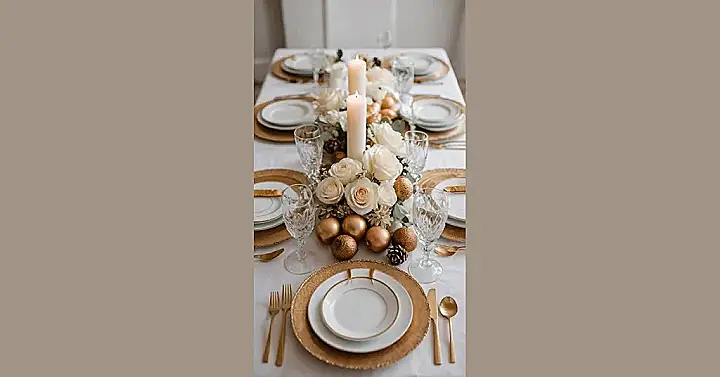 Thinking your dinner table needs to go from “meh” to “wow” without needing a degree in fancy-pants arranging? Take a peek at this setup – it looks super elegant, right? But if you break it down, it’s mostly just clean plates stacked neatly on some shiny placemats, some cutlery that isn’t plastic, and a centerpiece that looks like it came straight out of a magazine but probably just involves grouping some pretty flowers, candles, and maybe some sparkly gold balls or pinecones you found. It’s proof you don’t need a magic wand to make dinner feel a bit special; just a few simple steps turn boring into brilliant.