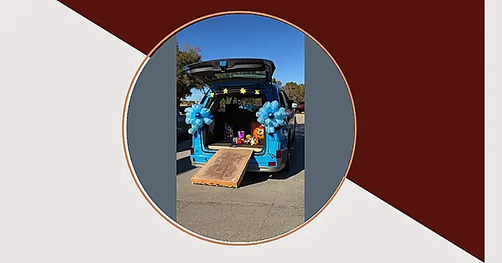 This car is ready to take on the neighborhood for Trunk or Treat! With its bright blue paint job, festive balloons, and a trunk full of spooky treats, this car is definitely going to be a hit with the little ghosts and goblins. It’s almost like a mini-Halloween party on wheels! Who needs a haunted house when you can have a haunted trunk?