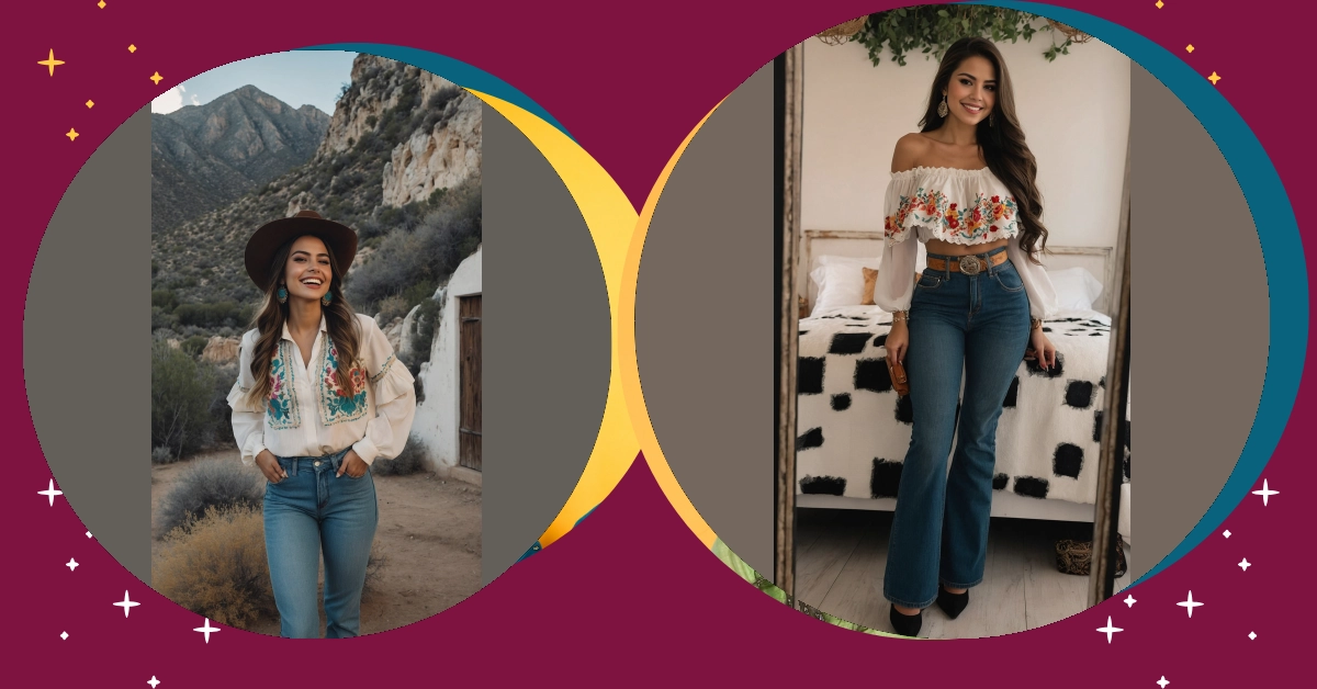 Let’s talk about those jeans! Forget your basic skinny jeans; these flared beauties with their matching vibrant embroidery at the bottom are next level. They connect perfectly with the traditional Mexican rancho style, but with a super fresh twist. You almost expect her to do a little happy dance, showing off those amazing details as she struts through the tall grass. Whether she’s heading to a fiesta or just making a trip to the feed store look like a runway show, this whole look proves that ‘country chic’ can be incredibly stylish and fun. It’s an outfit that says, ‘I might get my boots a little dusty, but I’ll look fabulous doing it!’