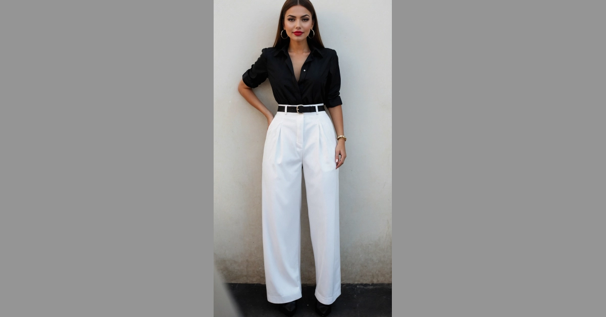 Whoa, check out this outfit! She’s rocking those high-waisted white pants with a slick black shirt like it’s no big deal. It’s the kind of “looks chiques” that makes you wonder if she was born looking this put-together, or if she has a secret style superpower. Probably both. And those wide legs? So comfy yet so cool, proving you don’t have to wear sweatpants to feel like a fashion guru.