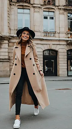 Hey there, fashion friends! November’s here, which means goodbye pumpkin spice lattes (okay, maybe not *goodbye*!), and hello to cozy, casual outfits that won’t leave you shivering. This picture shows the perfect example! Imagine strolling through a fancy city (maybe Paris?!) looking effortlessly stylish in a long, beige trench coat. It’s like wearing a giant, comfy hug that’s also super chic. Pair it with some dark jeans and white sneakers – boom! You’re ready to conquer November’s chilly breezes and look amazing doing it. Who needs a bulky winter jacket when you have this stylish armor?