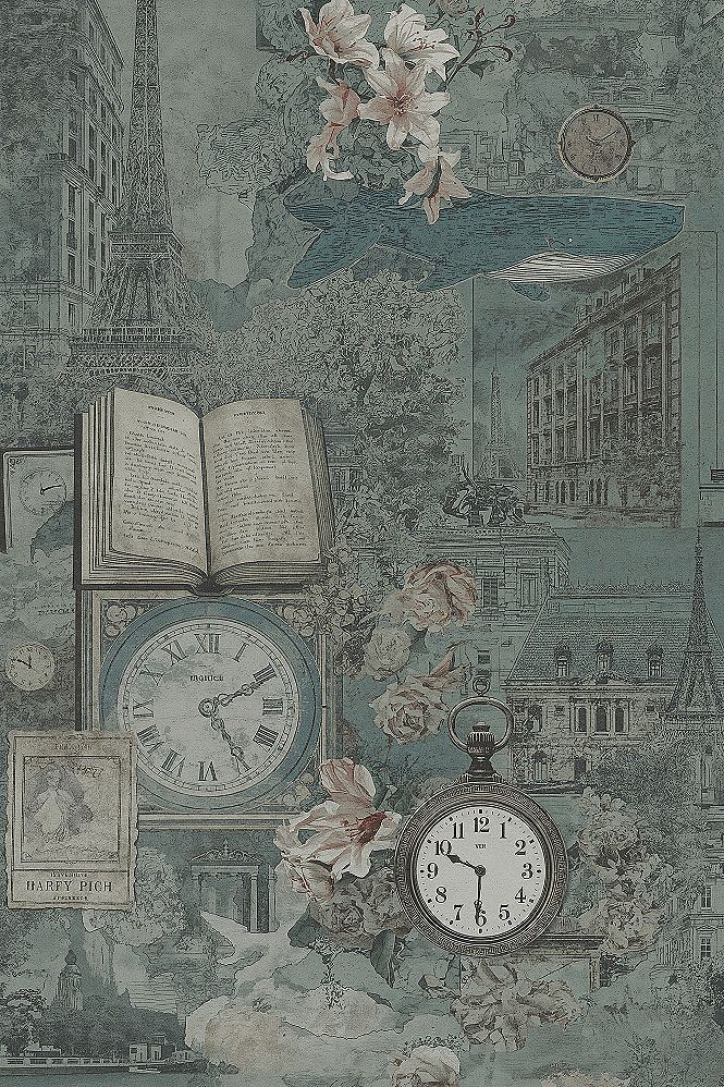 Explore a unique creative phone background with this dreamy vintage collage, blending old-world charm with surreal elements in muted green and grey tones. Featuring cityscapes, books, lilies, and a whale, it’s a true piece of art for your wallpaper.