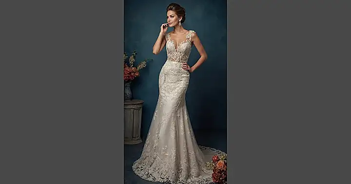 Take a look at this ‘fit and flare wedding dress’, and you can tell it’s not messing around when it comes to style. It hugs all the right curves like it’s giving you the world’s best hug, making sure you feel absolutely amazing from top to… well, almost bottom! With that intricate lace and the super cool sheer neckline, you might just feel like you’re about to walk a red carpet instead of an aisle. Just don’t try to hide any snacks in this perfectly fitted number – it’s designed to show off your fantastic self, not your secret stash of pre-wedding cookies!