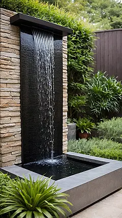 You know that plain, unexciting wall in your backyard that’s just… there? Well, meet its glow-up! This isn’t just any old wall; it’s practically a spa day for your garden. With sleek, dark panels and those cool stone accents, this outdoor wall fountain transforms a flat surface into a mini-waterfall wonderland. It’s like your house decided to grow its own little, elegant, perpetually running faucet – only way more stylish and without the surprise water bill from leaving the tap on!