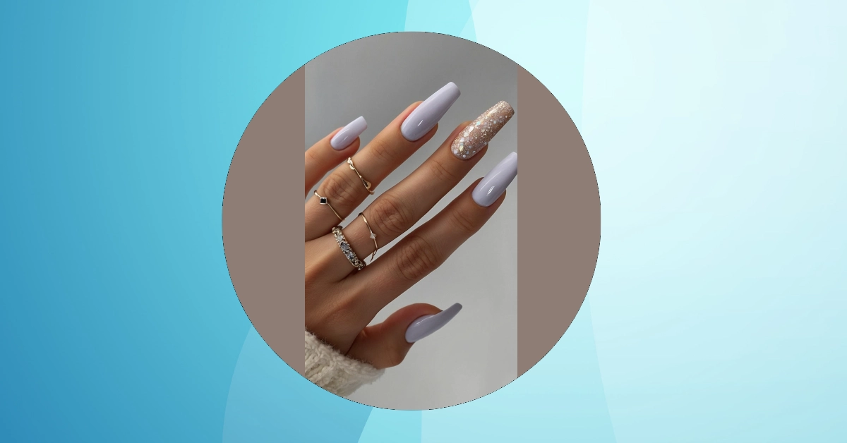 These nails are seriously cute! Imagine snuggling up by the fireplace with a hot cocoa, wearing your fluffiest sweater, and sporting these gorgeous winter-themed nails. The soft lavender shade is like a snowy twilight, and that one nail with the sparkly glitter is like a magical snowflake catching the light. It’s the perfect combo of subtle elegance and festive fun – way better than accidentally getting frostbite!