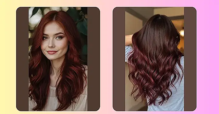 This hair color is like a sunset in a bottle! It’s got that deep, rich red that makes you think of juicy cherries, but with a hint of brown that gives it a touch of sophistication, like a fancy cherry cola. Imagine walking into a room and everyone just stopping to look at your hair – that’s what this color does! It’s totally eye-catching, but it’s still soft and flattering. Plus, if you’re feeling daring, you can even add some lighter streaks to make it pop even more.
