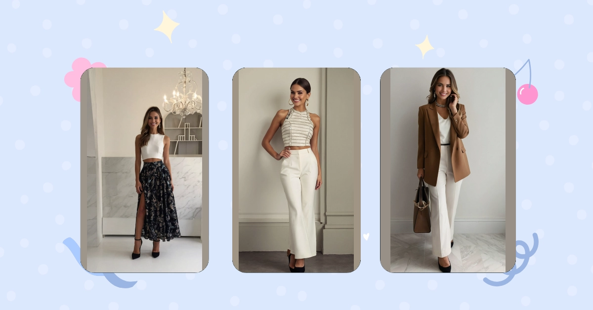 Looking for the perfect “spring outfits for women?” Check out this boss-level look! It’s like, business on the top with that sleek white blouse, but party on the bottom with those super cool, cropped blue pants. Plus, those heels? Total game-changer. You could rock this at school, a fancy lunch with your grandma, or even just strutting your stuff down Main Street.