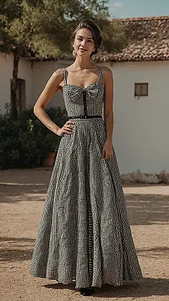 Our friend rocking this look totally owns the scene, standing there with a confident smile that says, “Yes, I know I look fabulous, and yes, I could totally twirl dramatically right now.” The flowy skirt is perfect for making an entrance, or maybe even hiding a super secret spy gadget (you never know!). She looks ready for anything, from a fancy garden party to just casually looking amazing while exploring somewhere sunny. This Gingham gem isn’t just a dress; it’s a whole vibe, proving that sometimes, the simplest patterns make the biggest impact.