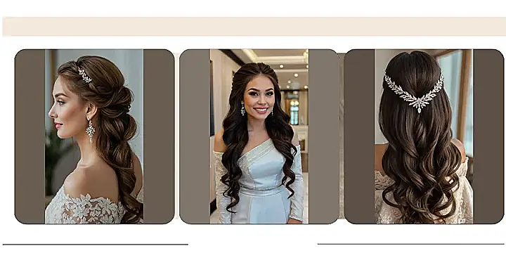 Think of this hairstyle as the ultimate “glow up” before all the wedding cake pics start snapping. The hair clip is like a tiny disco ball for your head, catching all the light and making you look like you’re starring in your own rom-com. Plus, waves are way easier to manage than trying to do some complicated braid that ends up looking like a bird’s nest. Score!