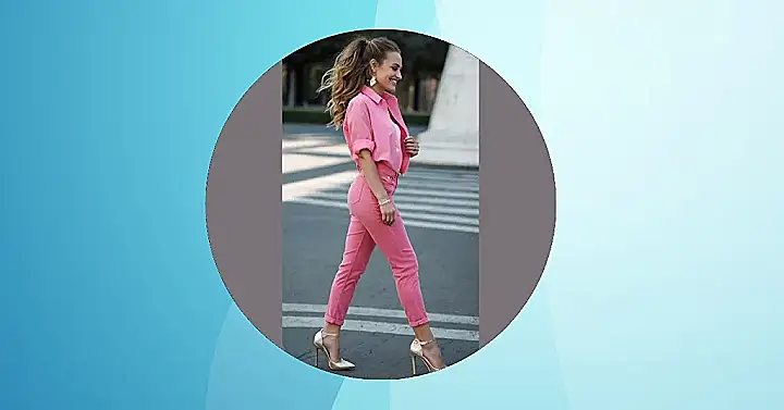 Whoa, check out this power outfit! Pink jeans are cool, but add a matching blazer and suddenly you’re ready to ace that presentation or, like, run a small country. The light blue jeans give a chill, casual vibe that keeps the whole look from being too formal, because who wants to look like they’re trying *too* hard? Bonus points for the matching pink heels – talk about commitment to the color scheme!