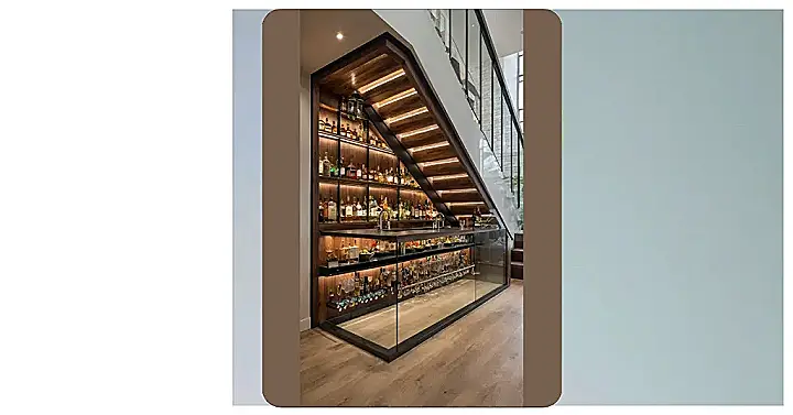 That weird, sometimes spooky space under the stairs is usually just a hideout for dust bunnies and things you forgot you owned. But someone looked at that forgotten corner and thought, “Nope, this needs more sparkle!” This cool design totally transforms that awkward spot into a super awesome, lit-up bar. It’s like your house suddenly got a secret hidden level, turning dead space into the most interesting place to hang out (maybe with some fancy snacks if you’re not serving drinks!).