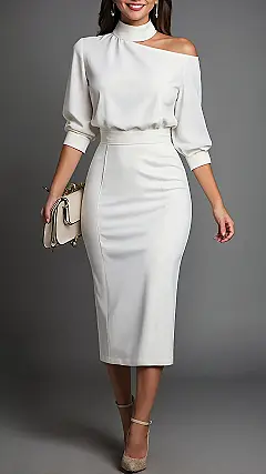 Talk about a glow-up! This dress isn’t just wearing white; it’s making a statement. With its super sleek fit and that cool, off-the-shoulder look with a fancy high neck, it totally nails “chic dress classy.” You can practically hear it saying, “Yes, I am important, and yes, I have my life together.” It’s the perfect outfit for when you want to look effortlessly sophisticated, like you just stepped off a runway, or maybe just arrived at the school assembly and are secretly planning to take over the world. Just try not to get any pizza on it – white dresses and pepperoni grease are basically arch-nemeses!