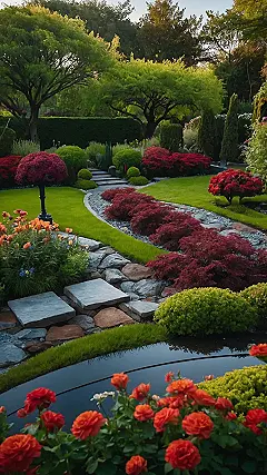 This garden is so fancy, it’s got a pond just for its rocks to hang out in! The water is clear and blue, like a swimming pool for frogs. There are even little lily pads floating around, making the whole thing look like a picture from a fancy magazine. The rocks are super smooth, like someone polished them by hand.
