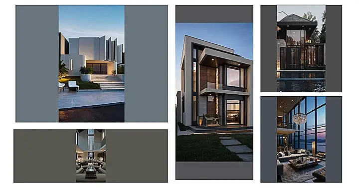 This house is so modern and sleek, it looks like it’s straight out of a magazine! It’s all white and shiny, with super cool geometric shapes. You can almost picture the glamorous parties happening inside, filled with people wearing fancy clothes and sipping fancy drinks. It’s like something you’d see in a movie!