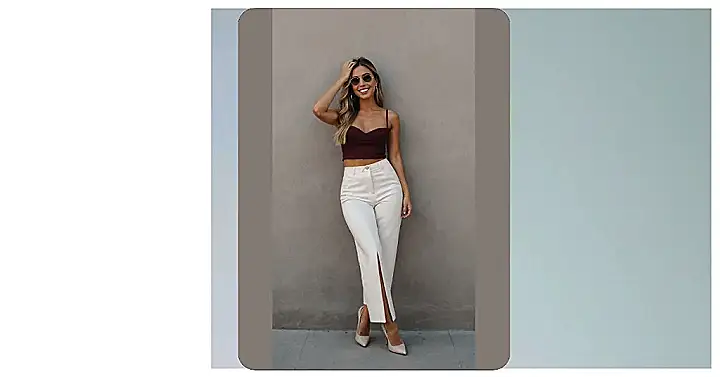 Okay, let’s talk about those white pants for a second. Wearing white pants takes a certain level of confidence, because you’re basically daring the universe to throw a ketchup packet your way. But when they look *this* good, especially with those killer heels and the little leg slit, it’s totally worth the bravery. This is one of those chic looks that proves you don’t need a million layers or accessories to look like you stepped straight out of a fashion magazine.