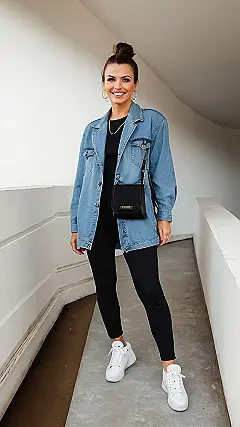 This lady is rocking a look that’s totally on trend, even if she’s just running errands. Her denim jacket is super comfy, and her black leggings and white sneakers make her look casual and cool. She’s definitely not afraid to wear jeans, even though everyone says “mom jeans” are a thing of the past. Who says you can’t be stylish and comfortable at the same time? She’s proving that moms can be super stylish, even if they’re just taking the kids to soccer practice. Go mom!