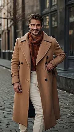Hey there, fashion-forward fellas! Winter’s chill doesn’t mean your style has to hibernate! Check out this dude rocking a seriously awesome winter look. That camel-colored coat is totally on point – it’s like a warm hug for your shoulders, but way more sophisticated than your grandma’s knitted blanket. And those dark pants and brown shoes? It’s the perfect balance of stylish and practical. Who needs snow boots when you can look this good while navigating the icy sidewalks? (Just maybe avoid slipping, okay?)