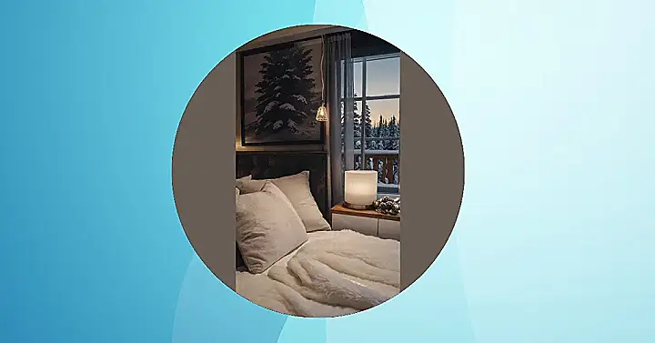 This bedroom looks like the perfect place to curl up with a good book on a snowy day. The fluffy blanket and soft pillows invite you to relax, while the picture of the snow-covered forest makes you feel like you’re right in the middle of a winter wonderland. The warm lights add to the cozy atmosphere, and the little touches of winter decor, like the pine cones and the fuzzy throw, make it feel extra special. You can almost hear the gentle sound of snow falling outside as you snuggle in for the night!