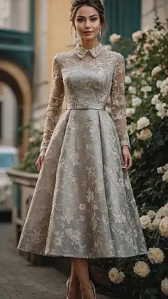 This dress isn’t just pretty; it’s got layers of ‘classy’ piled on like a fancy wedding cake – but way less crumbly! From the elegant high neck to the way it perfectly hugs the silhouette, it’s basically a masterclass in looking polished without actually trying too hard (or at least making it look like you didn’t). You’d feel like you should be sipping sparkling cider with your pinky up, trying your best not to spill anything on those gorgeous patterns. It’s the ultimate ‘I came, I saw, I conquered the fashion scene’ look, making everyone else wonder if they also need a gown just to grab a smoothie.