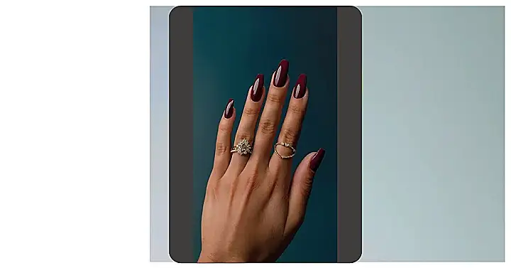 Wow, check out those nails! That rich burgundy color is seriously sophisticated, like a grown-up version of your favorite Halloween candy. It’s the perfect autumnal shade, and those perfectly shaped nails are giving major “I just got a mani-pedi and I’m feeling myself” vibes. The sparkly ring is just the cherry on top – it’s like the nails are whispering secrets to the ring, saying, “Hey, we’re a total power team!”