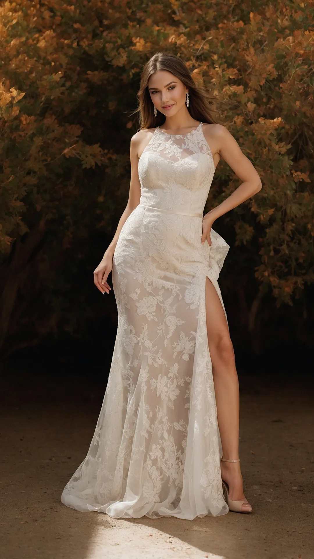 Stepping out in a classy evening gown like the one in this picture would make anyone feel like they just won the lottery for fancy dress-up! This dress, with its delicate lace details and that gorgeous sweep of fabric, looks like it was designed to make heads turn and jaws drop. You can practically hear the “wow” factor as you gracefully glide through the room, probably trying your best not to trip over your own fabulousness. It’s the kind of outfit that makes you want to spontaneously break into a slow-motion walk, just like in the movies, complete with dramatic hair flips!