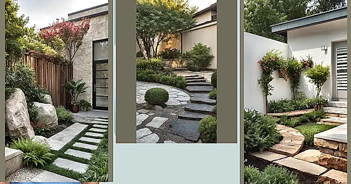 You might think a small garden means just a couple of lonely potted plants, but this picture totally flips that idea on its head! This isn’t just a garden; it’s a mini-jungle adventure, perfectly squeezed into a cozy spot. We’ve got sleek stepping stones that look like they’re playing hopscotch on a plush green carpet, a stylish little tree reaching for the sky, and so many different types of plants having a leafy get-together. It’s the kind of place where every plant knows your name and you definitely won’t need a map to find your way back to the door.
