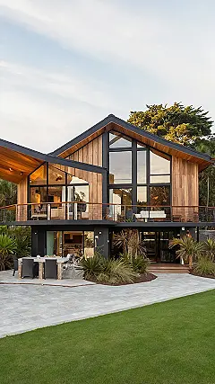 This beach house design is seriously showing off. Look at all those windows! It’s like the builders ran out of walls and just decided, “Eh, let’s put glass everywhere.” You could probably watch seagulls plotting world domination from the living room. Forget curtains, your privacy is now sponsored by the giant tree next door. But hey, imagine waking up and seeing the whole sky without even getting out of bed. Plus, the mix of the warm wood and slick black frames makes it look less like a house and more like a giant, awesome art installation you can actually live in.