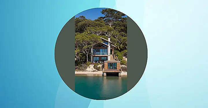 This beach house design is seriously showing off. Look at all those windows! It’s like the builders ran out of walls and just decided, “Eh, let’s put glass everywhere.” You could probably watch seagulls plotting world domination from the living room. Forget curtains, your privacy is now sponsored by the giant tree next door. But hey, imagine waking up and seeing the whole sky without even getting out of bed. Plus, the mix of the warm wood and slick black frames makes it look less like a house and more like a giant, awesome art installation you can actually live in.