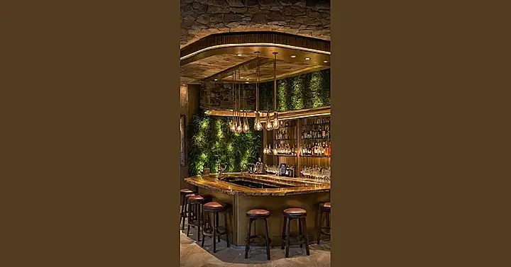 Building a cool house bar like this one is basically like being a mad scientist, but with furniture, lighting, and maybe some leafy friends. You get to pick awesome stuff like that rough stone wall that looks like it belongs in a castle, or a whole wall covered in green stuff that makes you feel like you’re chilling outside (but without the mosquitos!). And check out that smooth, glowing countertop – it’s like the bar itself is showing off. It just proves your house doesn’t have to be boring; it can have its own secret level of awesome design ready for maximum chill time.