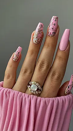 These nails are like a spring garden party exploded onto your fingertips! You’ve got the pretty pink base which is totally on point for spring, and then BAM, you’re hit with all the sparkles and swirls. It’s like they took inspiration from a fancy Easter egg hunt, but instead of finding chocolate, you’re finding super cute nail art! Just try not to accidentally scratch your friends when you’re showing them off – those embellishments look like they mean business!