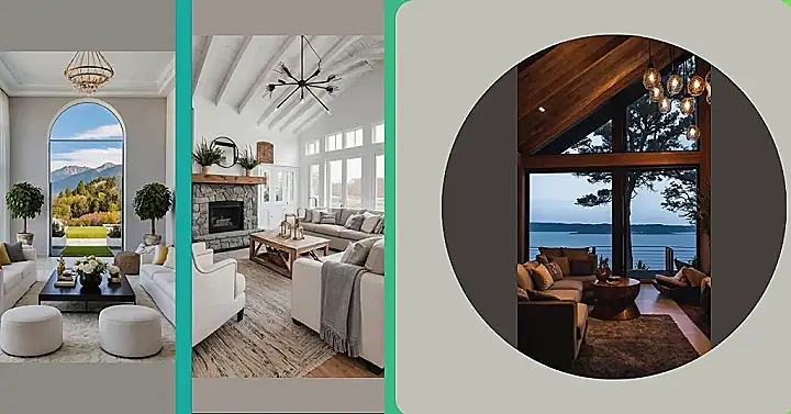 Stepping into this room feels like walking into a postcard, except way comfier. That huge arched window isn’t just a window; it’s a giant TV screen playing the best nature documentary ever, with real mountains and colorful trees putting on a show. We’re talking ‘lake house decor,’ but let’s be real, this place upgraded from a humble lake to a whole mountain range – talk about a glow-up! You can practically high-five a cloud from here, making you wonder if a lake would even fit in such a majestic view anyway.