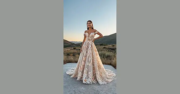 This dress isn’t just about the flowers; it’s about the whole vibe! Standing in that gorgeous light, looking all confident and happy, you can tell this dress just makes you feel good. The soft, blush-colored flowers spilling over the off-shoulder neckline give it a super romantic yet playful touch, perfectly matching that beautiful outdoor setting. You’d feel like a total nature queen, strutting your stuff with a train that looks like a flower path following behind you. It’s truly a dream dress that’ll have everyone saying, ‘Whoa, where did she find that masterpiece?’