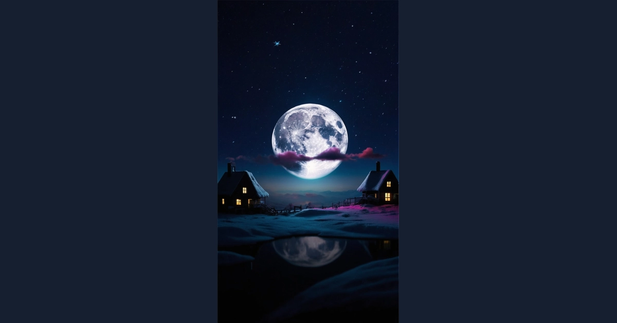 This image is like a scene straight out of a winter wonderland, with the moon shining so bright it’s almost like daytime! Can you imagine waking up on Christmas morning to this view? It’s like the moon is saying “Merry Christmas!” to the cozy little houses nestled in the snow. You almost expect to see Santa flying through the sky, with Rudolph’s nose shining even brighter than the moon!