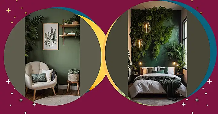 Imagine waking up in this room every morning! It’s like your own secret jungle hideaway, but with way more comfy pillows. With the green walls and all those plants, you might even start thinking you can talk to squirrels (just kidding… mostly). Just try not to get lost looking at yourself in that leafy mirror – you’re gorgeous, but those ferns need some attention too!