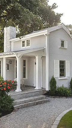 Staring at this adorable grey cottage, you can practically feel the good vibes emanating from it. With its welcoming front porch, complete with those sturdy white columns and a sneaky little wicker chair just begging for someone to sit and sip lemonade, it’s the definition of ‘come on in!’ Those vibrant red-orange flowers by the steps are like a friendly high-five, making the whole place look like it’s always ready for a sunshine-filled afternoon. This isn’t just a pretty picture; it’s like a perfectly planned hideout from the world’s chaos, making it a stellar example for anyone dreaming up their own perfect cottage house plans.