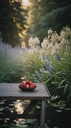Imagine this: you’re chilling by a peaceful pond, surrounded by flowers that look like they’re straight out of a fairytale. The sun is setting, painting the sky in gorgeous colours, and you’ve got a bowl of juicy, delicious nectarines right there on a rustic table. It’s the perfect “beautiful tranquil place,” and honestly, it looks good enough to eat…the scene, I mean! (Although those nectarines look pretty tempting too!)