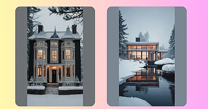 This house looks like something straight out of a holiday movie! Imagine cozying up inside with hot cocoa while watching the snow fall softly outside. The warm glow from the lanterns lining the steps leading up to the front door makes the whole scene feel magical, like a fairytale come to life. It’s the perfect winter house exterior, all decked out for the holidays— even the snow looks festive!