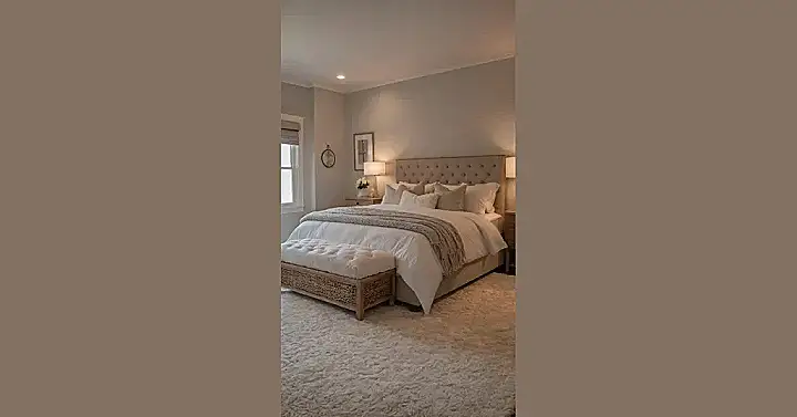 This bedroom looks so incredibly cozy, I’m pretty sure it’s designed to make you forget all your responsibilities exist the moment you walk in. Seriously, that bed is piled high with pillows like a fluffy mountain range, and the gigantic, shaggy rug looks soft enough to nap on the floor and be perfectly happy. It’s the kind of place where you just want to sink in, maybe turn into a human pretzel under that awesome chunky blanket, and never, ever emerge until pizza is mentioned.