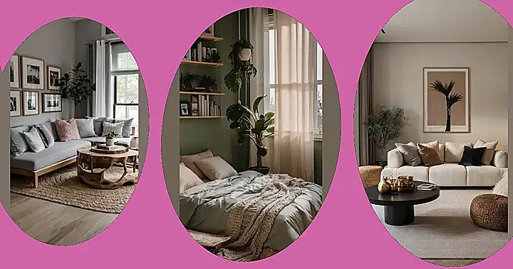 So, you want a chill zone that screams “I’m sophisticated but also love binge-watching Netflix”? This room’s got you covered! Check out that leafy art – it’s like saying “I appreciate nature,” even though the closest you get to nature is your mom’s house plants. And that pouf on the floor? Perfect for sprawling out while dramatically sighing over homework… or just, you know, napping.
