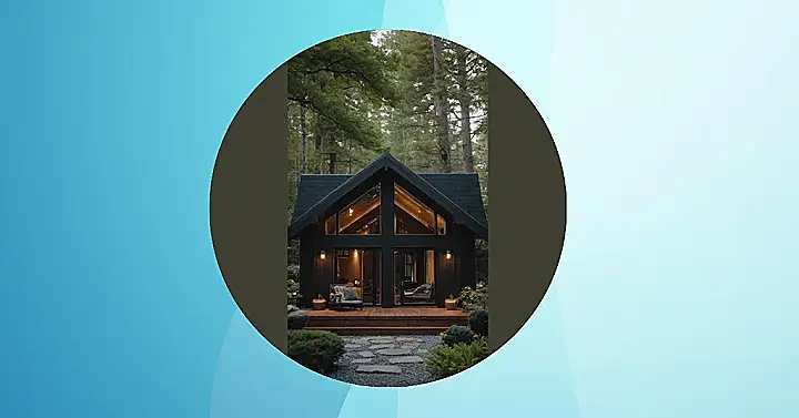 This cute little cottage is tucked away in the woods, looking like it belongs in a fairytale. It’s got a charming, rustic vibe with its stone walls and big, cozy windows. You can almost imagine sitting by the fireplace inside, sipping hot cocoa, and listening to the wind rustle through the trees outside.