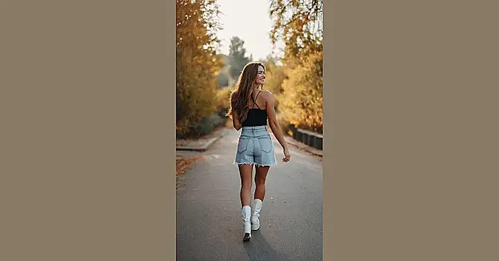 This girl’s got fall fashion figured out! She’s rocking a super cute outfit that’s perfect for a casual day out. Her denim shorts are totally on-trend, and the white boots add a little bit of edge. Plus, the black tank top is just the right touch of simplicity to make the whole outfit pop. It’s like she’s saying, “I’m comfortable, I’m stylish, and I’m ready for anything!”