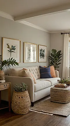 Check out how they used wall space to display art and stacked plants on a cool shelf thing. It makes the room feel taller and less cramped, kind of like wearing vertical stripes (but way more stylish). The fluffy rug probably makes the space look a bit bigger too. Adding little touches of nature can trick your brain into thinking your tiny room is a super cool jungle. Who needs a big backyard, you can just make your room your own personal jungle.